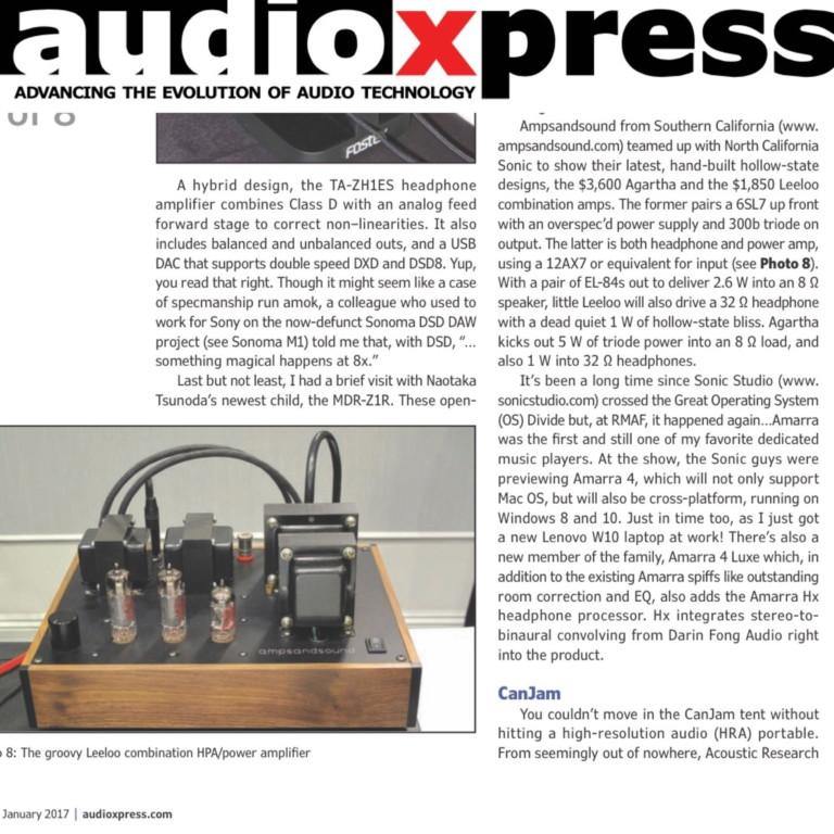 AudioExpress RMAF 2016 – ampsandsound coverage Ampsandsound from Southern California (www.ampsandsound.com) teamed up with North California Sonic Studios to show their latest, hand-built hollow-state designs, the $3,600 Agartha and the $1,850 Leeloo combination amps. The former pairs a 6SL7 up front with an overspec’d power supply and 300b triode on output. The latter is both headphone and power amp,using a 12AX7 or equivalent for input (see Photo 8). With a pair of EL-84s out to deliver 2.6 W into an 8 Ω speaker, little Leeloo will also drive a 32 Ω headphone with a dead quiet 1 W of hollow-state […]